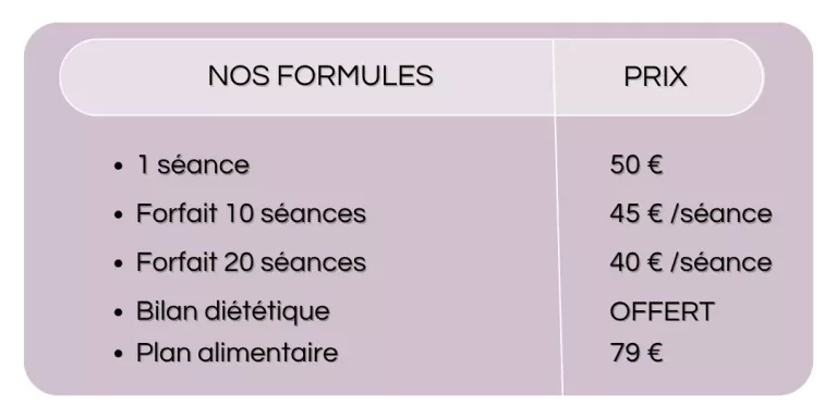 Oui, plusieurs formules sont disponibles : à la séance, en forfait 10 ou 20 séances, et avec ou sans suivi nutritionnel.